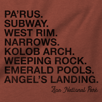 The most popular trails in Zion National Park are featured on this tee. Beautiful in its simplicity, this tee says Zion without shoving it in your face. It's a great way to celebrate the gorgeous Zion Canyon on a shirt that can be worn anywhere.